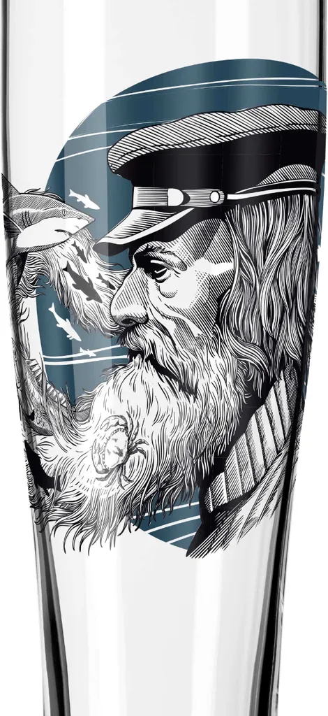 – Seemann und Krake. Das Design inszeniert mit akribisch ausgeführten Zeichnungen eine uralte Volkssage, die auf den Weizengläsern in mitreißenden Arrangements für neue Begeisterungsstürme sorgt.