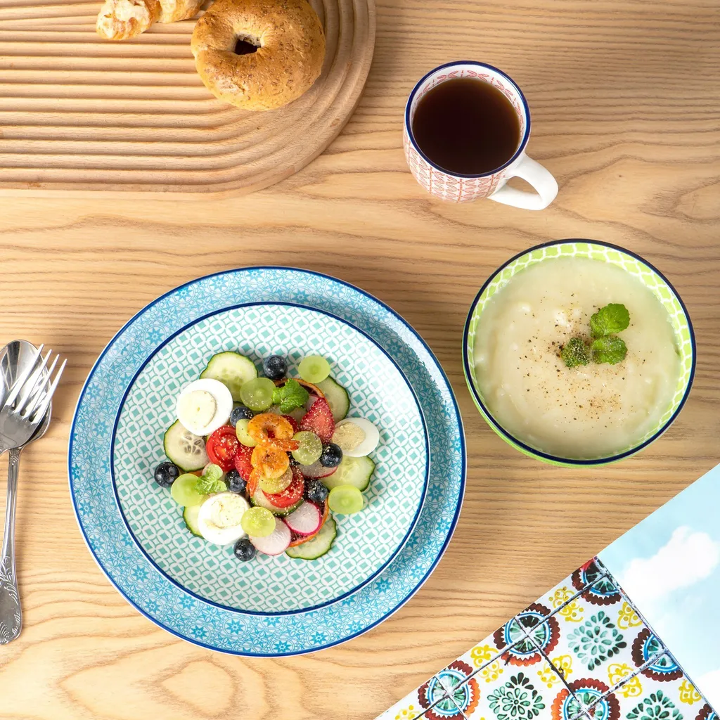 - 16-teiliges Set besteht aus 4 Kaffeebechern 360 ml, 4 Müslischalen Ø 15,2 cm, 4 Dessertteller Ø 21,5 cm und 4 Speisetellern Ø 26,5 cm. Zeitlose Form- und Farbgebung, innovatives Design und hochwertige Verarbeitung – bei allen Geschirrteilen sind die Dekoration vollflächig aufgebracht und perfekt zueinander abgestimmt, perfekt für den gedeckten Tisch!